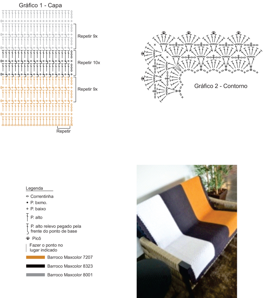Capa: com o fio na cor mostarda, fazer 207 correntinhas mais 3 corr. para virar e seguir o gráfico 1. Observar a troca de cor dos fios no gráfico. Depois, fazer 1 carr. de p. baixo ao redor, de acordo com as cores.