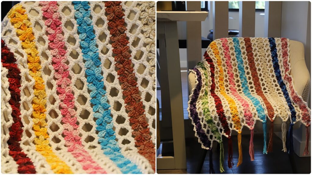 Após concluir as faixas individuais, é hora de unir e finalizar a manta. Faça 10 faixas iguais, uma de cada cor, e una-as na última carreira utilizando pontos baixos, seguindo o esquema de montagem. Para um toque final, adicione franjas nas pontas de cada faixa.