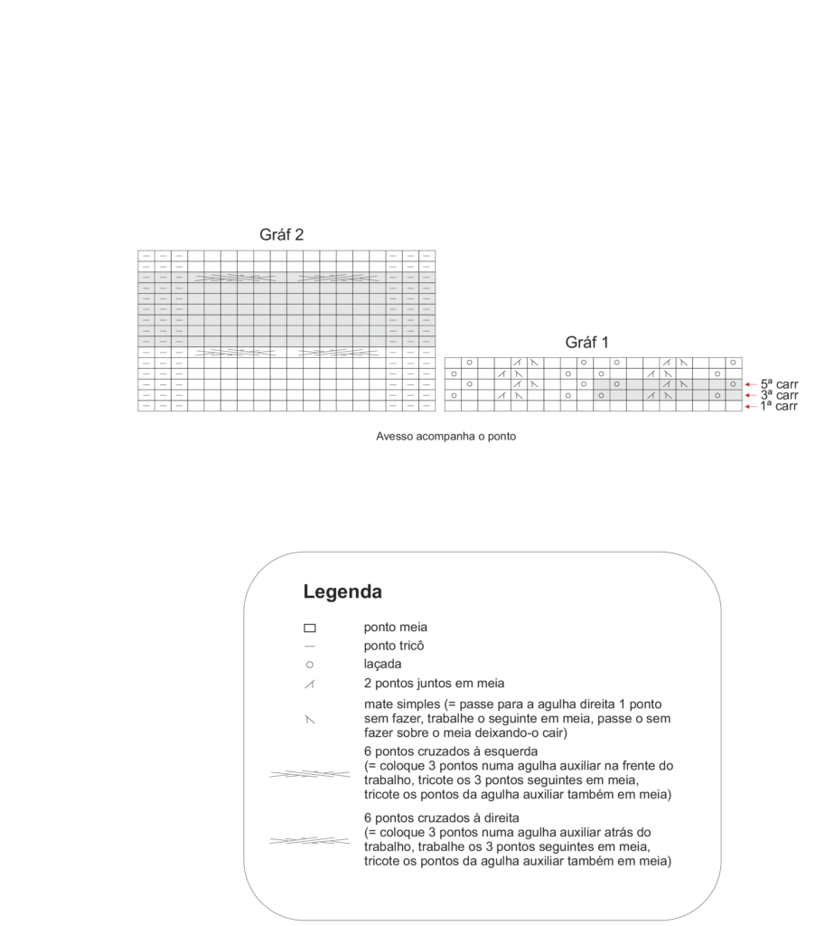 Abreviações: meia (m); tricô (t); laçada (laç); 2 pontos juntos em m (2 pjm); mate simples (= passe 1 ponto sem fazer para a agulha direita, tricote o seguinte em meia, deixe o sem fazer cair sobre o tricotado); pontos cruzados à direita e à esquerda. Monte 295 pontos na agulha circular e trabalhe em carr de ida e volta do seguinte modo: 1ª carr: 8 t, (81 m, 3 t, 12 m, 3 t) 2 vezes; 81 m, 8 t. 2ª carr e todas as carr do avesso: 8 t, acompanhe os 279 pontos centrais (onde aparece m, trabalhe m; onde aparece t, trabalhe t); termine com 8t. 3ª e 7ª carr: 8 t, [(1 m, 1 laç, 2 m, 1 mate simples, 2 pjm, 2 m, 1 laç) 9 vezes; 3 t, 12 m, 3 t] 2 vezes; (1 m, 1 laç, 2 m, 1 mate simples, 2 pjm, 2 m, 1 laç) 9 vezes; 8 t. 5ª e 9ª carr: 8 t, [(1 laç, 2 m, 1 mate simples, 2 pjm, 2 m, 1 laç, 1 m) 9 vezes; 3 t, 12 m, 3 t] 2 vezes; (1 laç, 2 m, 1 mate simples, 2 pjm, 2 m, 1 laç, 1 m) 9 vezes; 8 t. 11ª carr: 8 t, [(1 m, 1 laç, 2 m, 1 mate simples, 2 pjm, 2 m, 1 laç) 9 vezes; 3 t, 6 pontos cruzados à direita (= coloque 3 pontos numa agulha auxiliar atrás do trabalho, tricote 3 m, trabalhe os p da agulha auxiliar também em m); 6 pontos cruzados à esquerda (= coloque 3 pontos numa agulha auxiliar na frente do trabalho, tricote 3 m, trabalhe os p da agulha auxiliar também em m); 3 t] 2 vezes; (1 m, 1 laç, 2 m, 1 mate simples, 2 pjm, 2 m, 1 laç) 9 vezes; 8 t. Mantenha 8 t no início e no final da peça e na parte central acompanhe os gráficos 1 e 2 até atingir 170 cm de comprimento. Arremate todos os pontos. Corte fios com 32 cm de comprimento, junte 9 fios, dobre ao meio e pendure com franjas nos 2 lados sem acabamento. Artesã: Ateliê Círculo