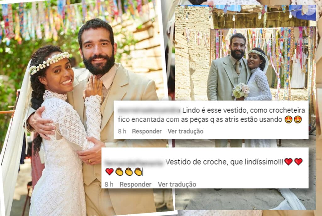 A celebração do casamento de Maria Santa (Duda Santos) e José Inocêncio (Humberto Carrão) em “Renascer” foi exibido ontem, e o grande destaque para nós recai sobre o deslumbrante vestido de noiva de Maria Santa, uma peça com um toque classico que vai além do convencional, sendo meticulosamente confeccionada com lindos detalhes de flores em crochê. A escolha por essa peça artesanal trouxe para a atriz um ar romantico e sofisticado que certamente encantou os telespectadores, e com certeza também as crocheteiras, como vemos em um dos comentarios na página da Globo no instagram de duas usuarias