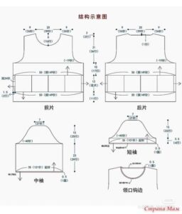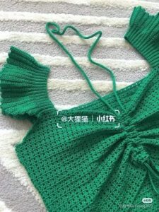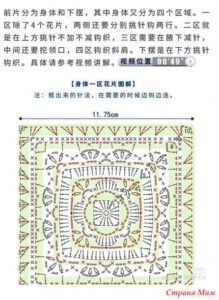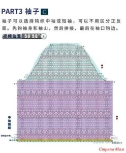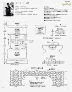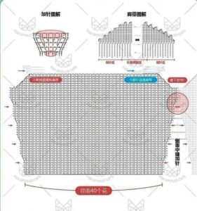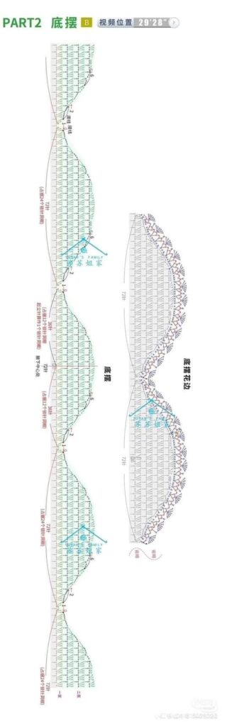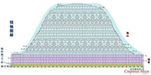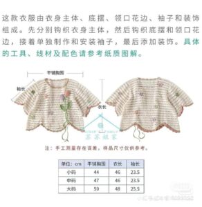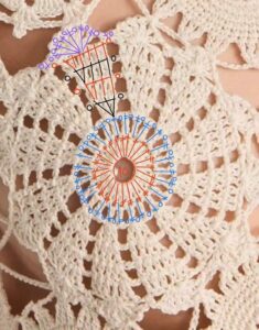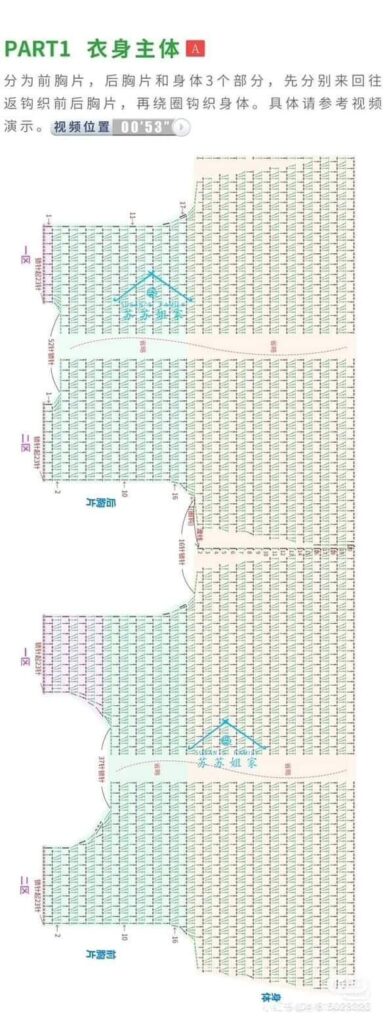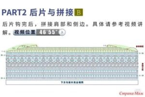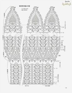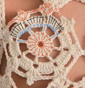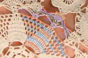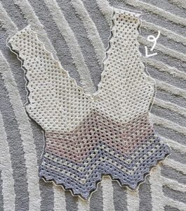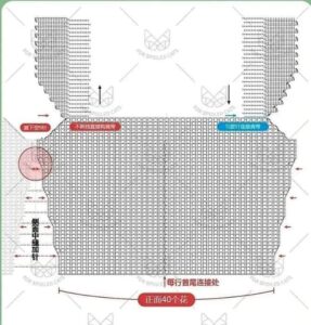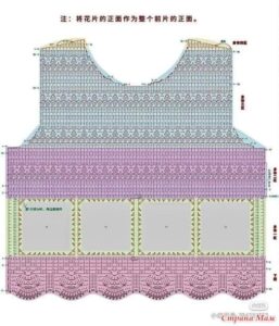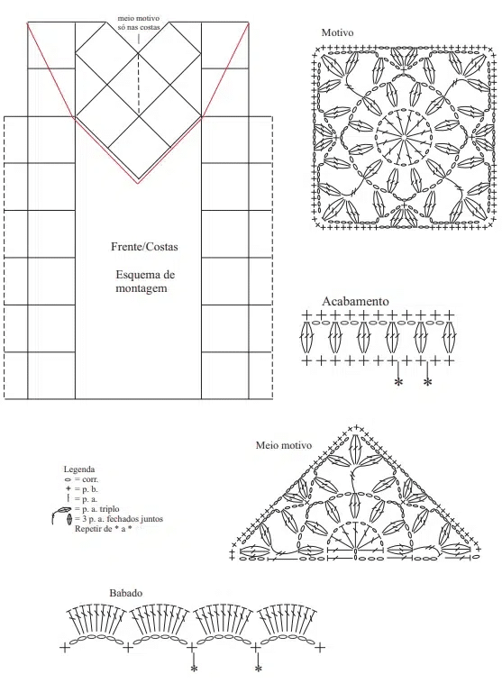 Acabamento: Faça a toda volta das cavas 2 carr. do babado seguindo o gráfico. Faça 2 carr. do babado seguindo o gráfico, seguindo a linha vermelha no esquema de montagem. Faça a toda volta do decote o acabamento seguindo o gráfico. Terminado o gráfico rem.. Faça na abertura das costas 2 carr. em p. b. e rem.. Pregue o botão na ponta do decote na abertura das costas do lado direito e abotoe entre os p. do lado esquerdo. Faça ao longo da borda inferior no início da peça uma carr. em p. b. e rem..