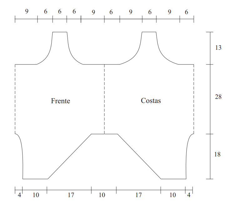 Costas – Use a mesma corr. do início e trabalhe as costas igual a frente. Estando frente e costas na mesma altura faça a união das duas partes, no lado da cava com uma corr. de 1 p. e no lado do decote com uma corr. de 24 p.. Continue em círculo e em p. a. duplo. A 46 cm do início do trabalho para a calcinha, dobre o trabalho ao meio pelas cavas e decote (linhas pontilhadas do molde). Para a frente conte 22 p. de cada lado da dobra e trabalhe em p. a. duplo nos 42 p. centrais, deixe de fazer de cada lado em cada carr.: 1 p. (13 v.) e rem.. Para as costas trabalhe nos 58 p. centrais, deixe de fazer de cada lado em cada carr.: 1 p. (5 v.) e 2 p. (8 v.) e rem..