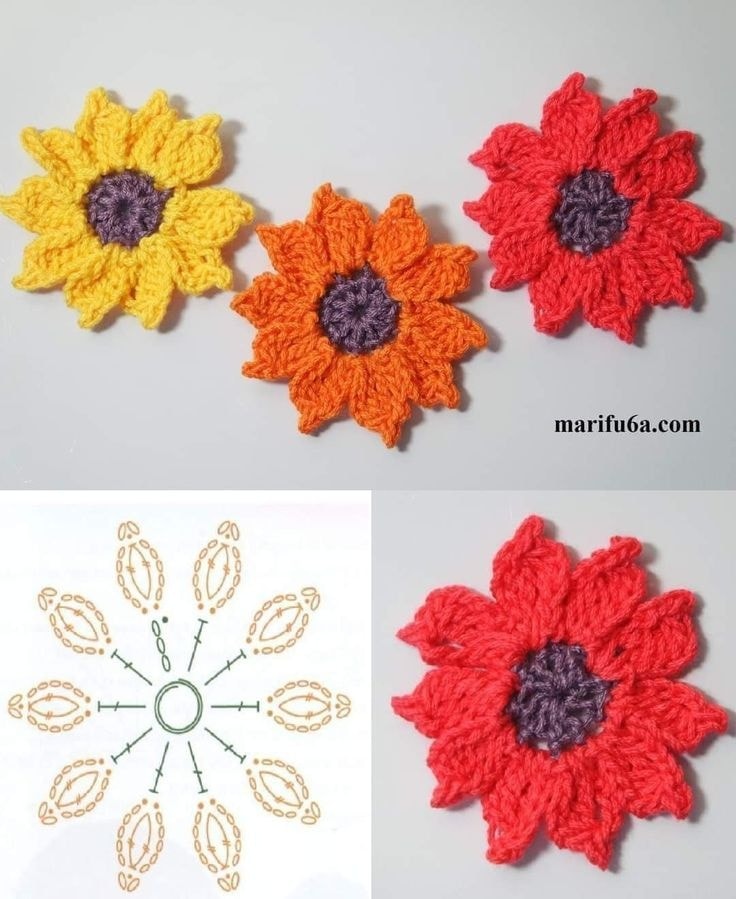 Para criar esses motivos, normalmente se começa com o centro da flor, usando pontos como correntinha, ponto baixo e ponto alto para formar pétalas delicadas. É possível trabalhar o motivo em uma única cor ou em várias, realçando a profundidade e o volume. Após finalizar o motivo, ele pode ser aplicado costurando ou colando em peças diversas, adaptando-se ao estilo desejado.