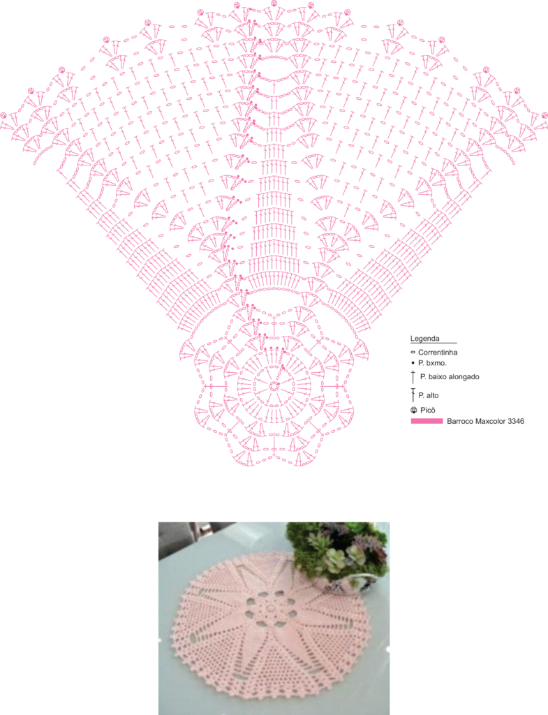 Com o fio na cor suspiro rosado, fazer 6 correntinhas, fechar em círculo com 1 p. bxmo. e seguir o gráfico. Artesã: Norma Spengler
