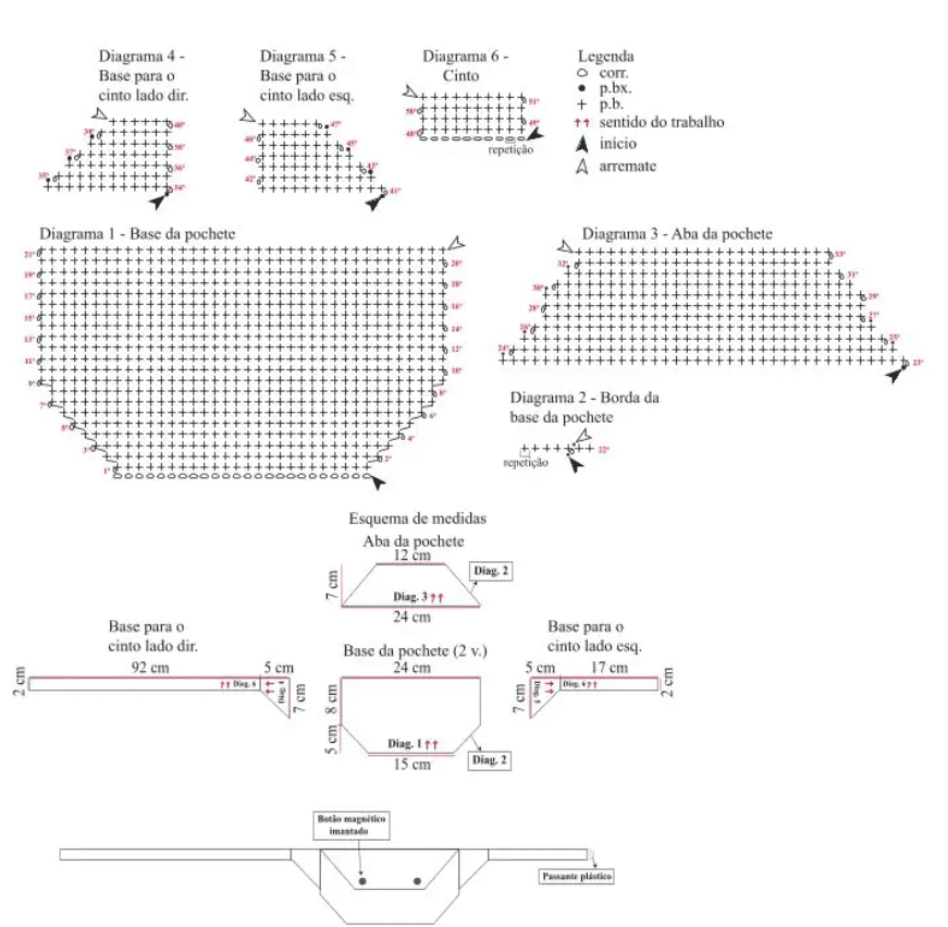 Base da Pochete Frente: Use a agulha de crochê de 3,0 mm e o fio Charme (duplo) nas cores desejadas. Inicie a peça pela parte inferior com um cordão de 24 correntinhas. Siga o diagrama 1 da 1ª à 21ª carreira.