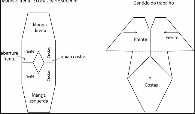 Trabalhe o outro lado igual. Faça a outra manga e una-as com *1 p.bx. no espaço entre os p., 1 corr.*, seguindo o esquema.