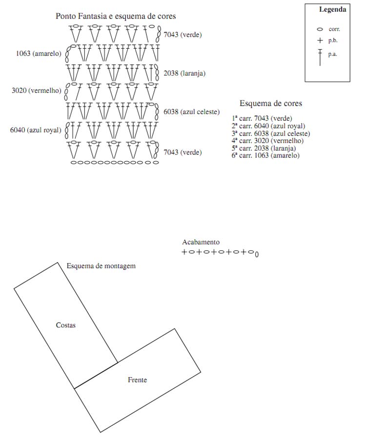 p. – ponto; ag. – agulha; nov. – novelo; carr. – carreira; rep. – repita; trab. – trabalhe; corr. – correntinha; p.a. – ponto alto; p. fantasia – acompanhar o diagrama; franja – acompanhar o passo a passo.