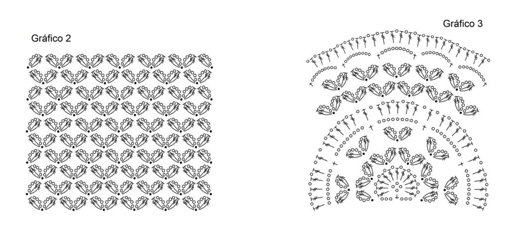 - Costas: Faça um cordão com 244 correntinhas e siga o Gráfico 1 até atingir 32 cm de altura. Depois, continue com o Gráfico 2 por quatro carreiras, subindo separadamente os ombros direito e esquerdo até a altura total de 58 cm.