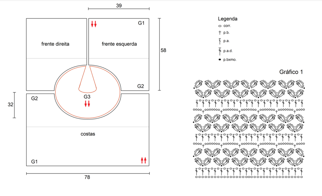 - Frente Direita: Inicie com 122 correntinhas e siga o Gráfico 1. Na primeira carreira, faça um ponto alto duplo e uma correntinha a cada dois pontos da base. Para a segunda carreira, trabalhe com dois pontos altos duplos finalizados juntos, intercalando com correntinhas e ponto baixíssimo. Continue seguindo o gráfico até completar 32 cm de altura. Após isso, passe ao Gráfico 2 para realizar as reduções no decote conforme o molde até completar mais 26 cm de altura.