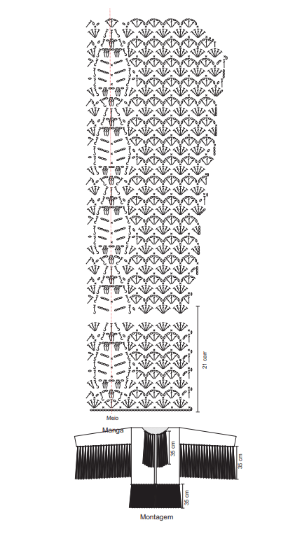 Mangas: Com o Anne faça 56 corr (55 de base + 1 de virada), 1 p.b. na 2ª corr a contar da agulha, (pule 2 corr, 5 p.a. na corr seguinte, pule 2 corr, 1 p.b. na próxima corr) 4 vezes; pule 2 corr, na corr seguinte faça [(1 p.a., 1 corr) 2 vezes); 1 p.a.]; pule 2 corr, (1 p.b. na próxima corr, pule 2 corr, 5 p.a. na corr seguinte, pule 2 corr) 4 vezes; 1 p.b. na última corr.