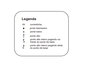 Pontos usados: correntinha (corr); ponto baixo (p.b.); ponto baixíssimo (p.bxmo); ponto alto (p.a.); ponto alto relevo pegando na frente/atrás do ponto de base.
