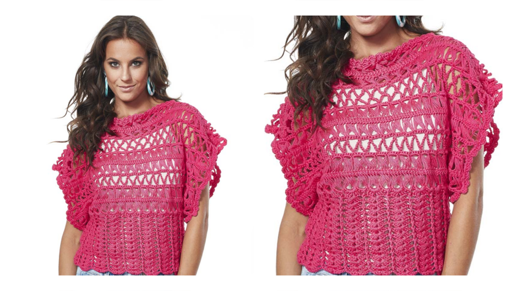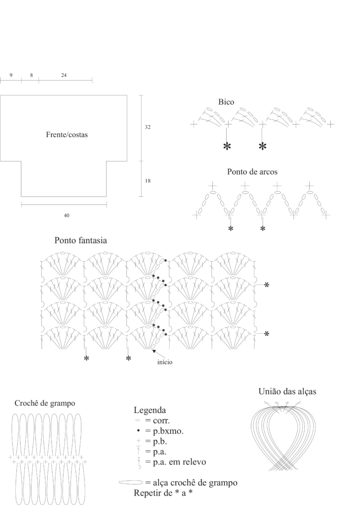 Frente e costas – São iguais toda trabalhada com 2 fios juntos. Comece pelas tiras de grampo. Tiras em crochê de grampo – Com fio duplo faça na agulha de grampo e ag. de crochê, 96 alças de cada lado dos p. b., (2 fios cada alça) seguindo o gráfico e as instruções da ag. de grampo. Terminado as alças rem. e deixe à espera. Faça 6 tiras iguais. Faça a união das alças das tiras seguindo o gráfico. Faça a união das tiras em p. de arcos, faça o p. b. do p. de arcos a cada 4 p. b. da união das alças, intercalando um p. b. em uma tira e 1 p. b. em outra tira. Una 3 tiras para a frente e 3 tiras para as costas. Para a união dos ombros trabalhe em p. de arcos nos p. de cada borda, deixe os p. centrais para o decote. Feche em p. de arcos a parte de baixo das mangas em 16 p. de cada lado das tiras. Para a parte inferior da blusa trabalhe em p. fantasia seguindo o gráfico a toda a volta frente e costas, repita de * a * no sentido dos p. (17 v.). A 18 cm do início do p. fantasia rem.. Faça a toda volta dos punhos e decote o bico seguindo o gráfico.