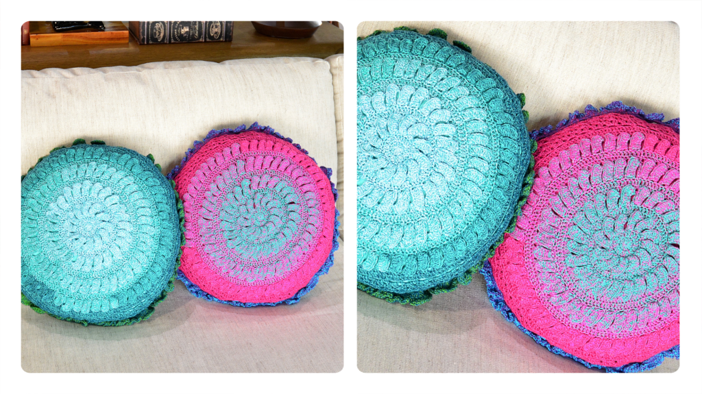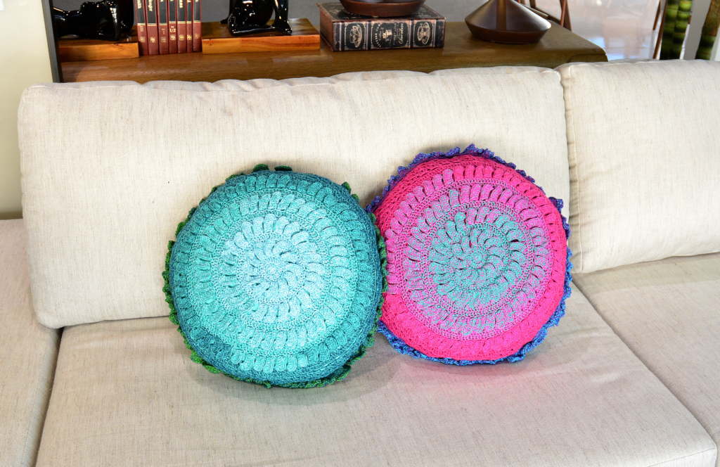Pontos usados: correntinha (corr); ponto baixo (p.b.); ponto baixíssimo (p.bxmo); ponto alto (p.a.). Almofada Campestre Execução: Comece com o anel mágico, suba com 3 corr e trabalhe 11 p.a. dentro do anel. Termine com p.bxmo na 3ª corr inicial. 2ª carr: 3 corr, 1 p.a. na base das corr, 2 p.a. em cada dos demais p.a.. Termine com p.bxmo na 3ª corr inicial. 3ª carr: 1 corr, 1 p.b. junto com o p.bxmo, *10 corr, 1 p.b. no próximo p.a., vire a alça e trabalhe 5 p.b. até na metade desta alça, 3 corr, vire novamente a alça e faça 1 p.a. na base das corr, 2 p.a. em cada dos 4 p.a. seguintes, 1 p.b. no próximo p.a. do círculo*. Repita de * a * e termine com p.bxmo na corr inicial. 4ª carr: 1 p.bxmo em cada das 4 corr seguintes, 1 p.b. na alça, *4 corr, passe a agulha atrás das pétalas e faça 1 p.b. na próxima alça de 10 corr*. Repita de * a * e termine com p.bxmo no p.b. inicial. 5ª carr: 3 corr, *4 p.a. na alça seguinte, 1 p.a. no próximo p.b.*. Repita de * a * e termine com p.bxmo na 3ª corr inicial. 6ª carr: 1 p.a. em cada p.a.. Continue conforme orientação do gráfico. Faça as costas da almofada a partir da frente. Por último, passe as voltas de acabamento. Almofada Sereia Execução: Comece com o anel mágico, suba com 3 corr e trabalhe 11 p.a. dentro do anel. Termine com p.bxmo na 3ª corr inicial. 2ª carr: 3 corr, 1 p.a. na base das corr, 2 p.a. em cada dos demais p.a.. Termine com p.bxmo na 3ª corr inicial. 3ª carr: 1 corr, 1 p.b. junto com o p.bxmo, *10 corr, 1 p.b. no próximo p.a., vire a alça e trabalhe 5 p.b. até na metade desta alça, 3 corr, vire novamente a alça e faça 1 p.a. na base das corr, 2 p.a. em cada dos 4 p.a. seguintes, 1 p.b. no próximo p.a. do círculo*. Repita de * a * e termine com p.bxmo na corr inicial. 4ª carr: 1 p.bxmo em cada das 4 corr seguintes, 1 p.b. na alça, *4 corr, passe a agulha atrás das pétalas e faça 1 p.b. na próxima alça de 10 corr*. Repita de * a * e termine com p.bxmo no p.b. inicial. 5ª carr: 3 corr, *4 p.a. na alça seguinte, 1 p.a. no próximo p.b.*. Repita de * a * e termine com p.bxmo na 3ª corr inicial. 6ª carr: 1 p.a. em cada p.a.. Continue conforme orientação do gráfico. Faça as costas da almofada a partir da frente. Por último, passe as voltas de acabamento. Artesã: Cristina Luriko
