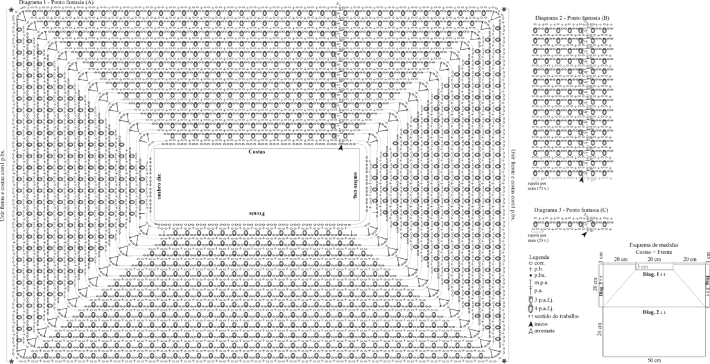 Amostra: um quadrado de 10 cm no p. fantasia (A – diag. 1) na ag. de crochê de 2,0 mm = 28 pts. x 14 carr.
