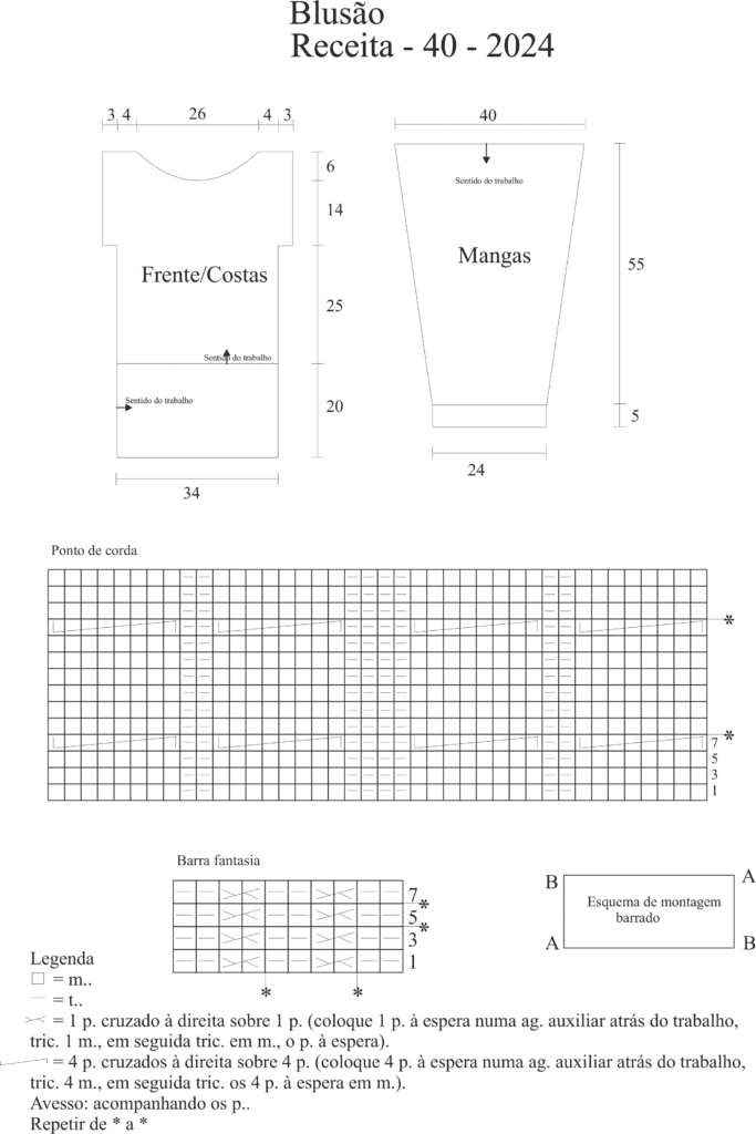 Pontos utilizados: Ponto meia: direito em m., avesso em t. Ponto tricô: tric. todas as carr. em m., ou t. Barra fantasia: siga o gráfico. Ponto de corda: siga o gráfico. Esquema de montagem (barrado)a: siga o gráfico.Amostra – Um quadrado de 10 cm em p. meia nas ag. nº 6,0 mm = 15 p. x 24 carr.Tamanho: 40