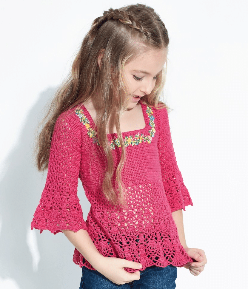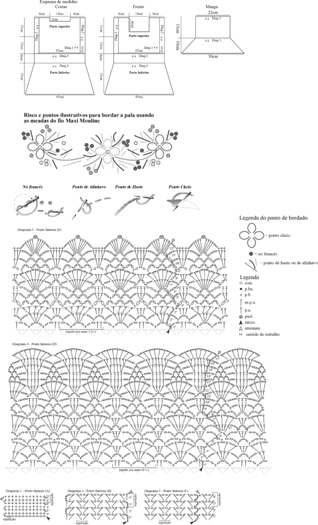 Tamanho: 6/8 anos Pontos utilizados no crochê: corr. – correntinha, p.bx. – ponto baixíssimo, p.b. – ponto baixo, m.p.a. – meio ponto alto, p.a. – ponto alto, picô – 3 corr., 1 p.bx., laçando a 1ª corr.. Pontos utilizados no bordado: nó francês, ponto de alinhavo, ponto de haste e ponto cheio. Abreviaturas: p.: ponto, pts.: pontos, nov. – novelo, carr. – carreira, ag. – agulha, trab.: trabalhe, diag. – diagrama, rep. – repita, v. – vezes, rem.; rematar. Execução: Transfira os moldes para o papel vegetal para usar como referência na execução da peça. Observe as setas no esquema de medidas com a indicação do sentido do trabalho. Parte das costas superior – Use a ag. de crochê de 2,0mm e o fio Charminho na cor tutti-frutti e inicie a peça abaixo do busto com um cordão de 27cm em corr., sobre este cordão trab. no p. fantasia (A) acompanhando o diag. 1, os pts. de rep. e o molde. À 23cm de comprimento desde o inicio rem. o fio. Trab. na peça anterior nas laterais no p. fantasia (B) acompanhando o diag. 2 e o p. de rep. por 2 carr.. Trab. em carr. de ida e volta nos diag. 1 e 2. Rem. o fio e reserve a peça. Parte da frente superior – Use a ag. de crochê de 2,0mm e o fio Charminho na cor tutti-frutti e inicie a peça abaixo do busto com um cordão de 27cm em corr., sobre este cordão trab. no p. fantasia (A) acompanhando o diag. 1, os pts. de rep. e o molde. À 23cm de comprimento desde o inicio rem. o fio. Trab. na peça anterior nas laterais no p. fantasia (B) acompanhando o diag. 2 e o p. de rep. por 2 carr.. Trab. em carr. de ida e volta nos diag. 1 e 2. Ao fazer a 2ª carr. das laterais da peça no diag. 2 unir a parte da frente superior com a das costas com p.bx. fechando somente (12cm), deixando a abertura das cavas de (11cm). Agora trab. a parte inferior da blusa frente e costas de uma só vez. Trab. no p. fantasia (C) acompanhando o diag. 3 e os pts. de rep. por 6cm. Na carr. seguinte trab. no p. fantasia (D) acompanhando o diag. 4 e o p. de rep. da 1ª até a 17ª carr.. Trab. nos diag. 3 e 4 em carr. circulares e feche cada carr. com p.bx. ou m.p.a. conforme indicado no diag.. Montagem e acabamento – Use a ag. de tapeçaria e o fio Charminho na cor tutti-frutti e una os ombros (6cm). Retorne para a ag. de crochê de 2,0mm e o fio Charminho na cor tutti-frutti e trab. ao redor das cavas as mangas no p. fantasia (C) acompanhando o diag. 3, os pts. de rep. por (13cm), na carr. seguinte trab. no p. fantasia (E) acompanhando o diag. 5 e o p. de rep. da 1ª até a 12ª carr.. Trab. nos diag. 3 e 5 em carr. circulares e feche cada carr. com 1 p.bx.. Ao redor do decote trab. o bico de acabamento em duas carr. de *1 p.b., 2 corr.*.. Trab. em carr. circulares e feche cada carr. com 1 p.bx.. Bordado ao redor da pala – Use a ag. de bordado e o fio Maxxi Mouline (3 fios) e borde ao redor da pala os ramos de flores como se apresenta na ilustração e na foto da peça. Mesclar as cores acima citadas do fio Maxxi Mouline nas flores e nó francês, nos ramos use os fios nas cores amarelo, verde abacate e verde bandeira. Os pontos bordados na pala são: p. de alinhavo, p. de haste, p. cheio e nó francês. Artesã: Vilma Maurer (1851)