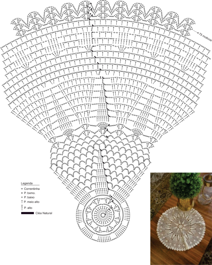 Tamanho: 51 cm de diâmetro. Confecção: com o fio na cor natural, fazer 8 correntinhas, fechar em círculo com 1 p. bxmo. e seguir o gráfico. Artesã: Norma Spengler