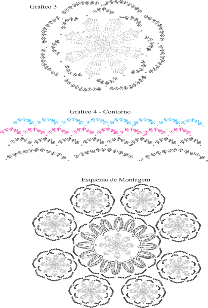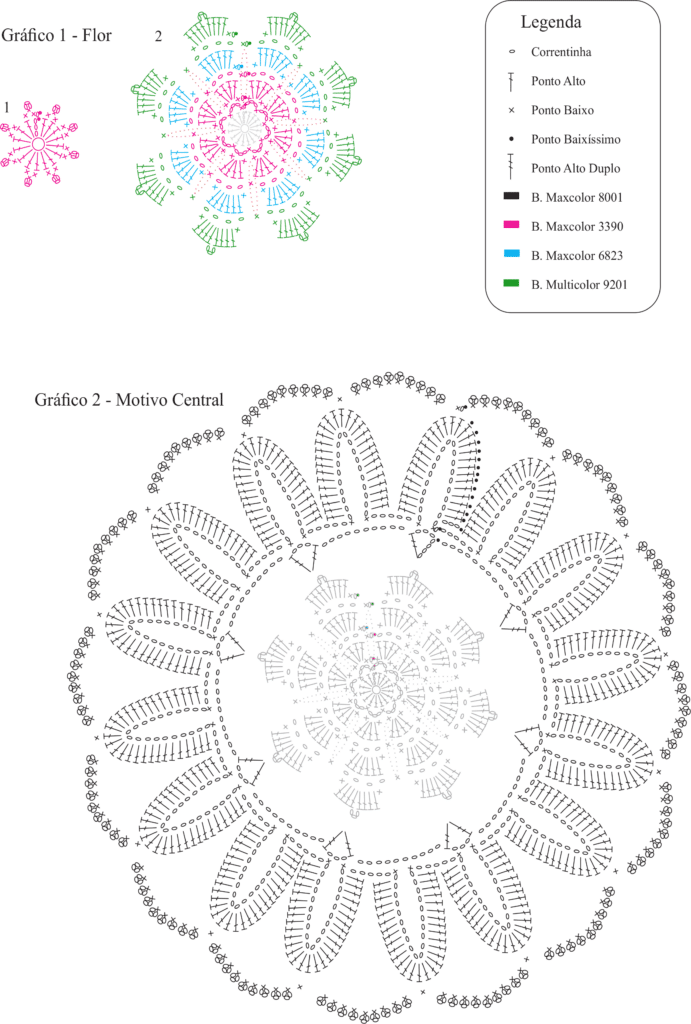 Abreviações: p.a. (Ponto Alto); p.b. (Ponto Baixo); corr. (Correntinha); p.b.x. (Ponto Baixíssimo); carr. (Carreira); p.a.d. (Ponto Alto Duplo) Execução: Gráfico 1 – Flor 1 (9x) Passo 1: com o fio Quartzo. Inicie um anel mágico. 1ª carr.: inicie com 3 corr.; dentro do anel faça mais 15 p.a.; Feche com p.b.x. 2ª carr.: trabalhe a carr. pegando apenas na alça da frente do ponto de base, inicie com 1 corr.; *1 p.b. 3 corr. volte na 1ª corr. com um p.b. formando um picô; 1 p.b. no próximo ponto de base;* repita de *a* até o final da carr. Feche com p.b.x. Passo 2: 3ª carr.: Trabalhe pegando apenas a alça de trás do ponto de base; inicie com 1 corr.; *1 p.b.; 3 corr. de espaço; pule um ponto de base;* repita de *a* até o final da carr. feche com p.b.x. 4ª carr.: inicie com 1 corr.; dentro da alça trabalhe, *1 p.b. 4 p.a. 1 p.b.;* repita de *a* até o final da carr. Feche com p.b.x. 5ª carr.: inicie com 1 corr.; *1 p.b.; 3 corr. de espaço* repita de *a* até o final da carr. feche com p.b.x. Arremate o fio. 6ª carr.: Emende o fio Serenity em uma das alças, inicie com 1 corr.; *1 p.b. 6 p.b. 1 p.b.* repita de *a* até o final da carr. Feche com p.b.x. Arremate o fio. 7ª carr.: Emende o fio Floresta , na 1ª carr. da flor, laçando junto as carr. anteriores; inicie com 1 corr.; *1 p.b. na 1ª carr. da flor, laçando junto as carr. anteriores; 4 corr. de espaço; * repita de *a* até o final da carr. Feche com p.b.x. 8ª carr.: inicie com 1 corr.; dentro da alça trabalhe *1 p.b.; 4 p.a.; 3 corr. 4 p.a.; 1 p.b.;* repita de *a* até o final da carr. Feche com p.b.x. Faça 9 Flores iguais, conforme gráfico 1, costure 1 pérola no centro de cada flor. Gráfico 2 – Motivos Central (1x) Emende o fio Branco, em uma das pontas da 8ª carr. da flor. 1ª carr.: inicie com 7 corr. 1 p.a.d. no mesmo ponto de base; *10 corr. de espaço; na próxima folha faça; 1 p.a.d. 3 corr. 1 p.a.d.;* repita de *a* até o final da carr. feche com p.b.x. 2ª carr.: inicie com 1 corr.; *1 p.b. 20 corr. 1 p.b.; 5 corr. de espaço; * repita de *a* até o final da carr. feche com p.b.x. Continue conforme gráfico 2, trabalhando em carr. circulares. Feche com p.b.x. Arremate o fio. Gráfico 3 (8x) Emende o fio Branco, em uma das pontas da 8ª carr. da flor. 1ª carr.: inicie com 1 corr.; * 1 p.b.; 5 picôs (3 corr. volta na corr. inicial com 1 p.b. para formar 1 picô);* repita de *a* até o final da carr. feche com p.b.x. Arremate o fio. 2ª carr.: emende o fio branco sobre o 3º picô de umas das alças da carr. anterior. Inicie com 1 corr.; * 1 p.b. 9 picôs; * repita de *a* até o final da carr. feche com p.b.x. Arremate o fio. Faça 8 Motivos iguais, realizando a emenda com p.b. conforme esquema de montagem. Gráfico 4 – Acabamento Emende o fio Branco sobre o 5º picô de uma das alças. 1ª carr.: inicie com 1 corr.; *1 p.b.; 11 picôs;* repita de *a* até o final da carr. Feche com p.b.x. Arremate o fio. Continue conforme gráfico 4, realizando as devidas trocas de cores. Feche com p.b.x. Arremate o fio. Artesã: Simone Eleotério