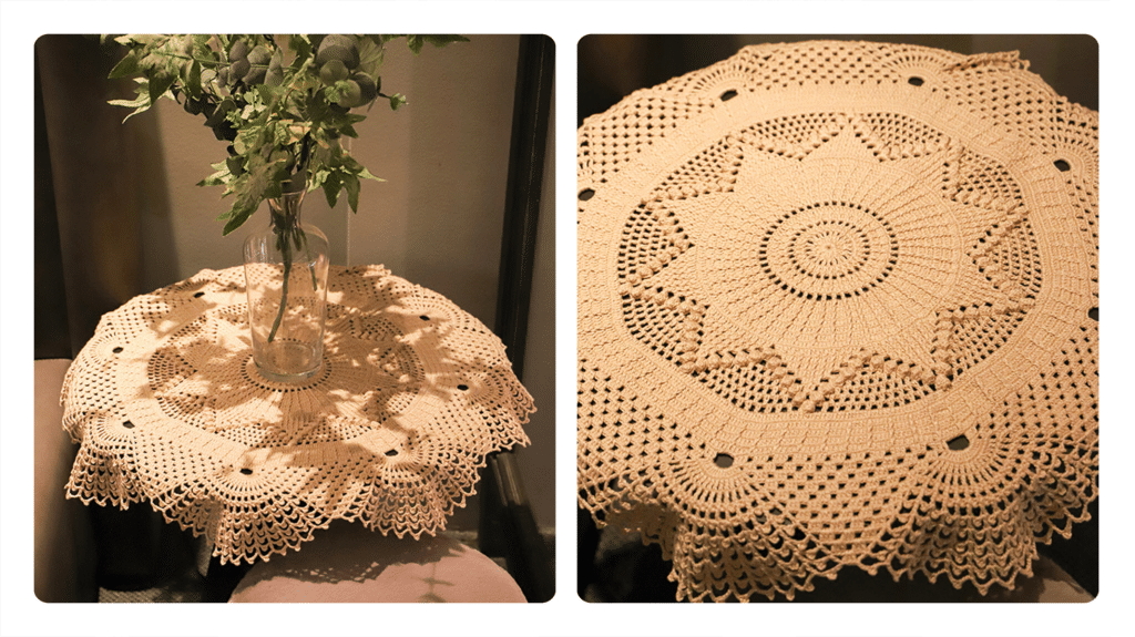 Cada centro de mesa em crochê redondo Flor de Porcelana é cuidadosamente confeccionado por artesãos talentosos, utilizando fios de alta qualidade e técnicas tradicionais de crochê. O resultado é uma peça única, onde cada ponto é trabalhado com precisão para criar um padrão floral que lembra a delicadeza da porcelana fina. Este centro de mesa não é apenas uma peça decorativa, mas também uma demonstração do amor e dedicação investidos em sua criação.