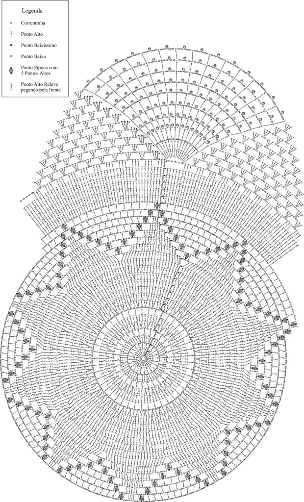 Pontos Utilizados: corr. (Correntinha); p.b.x. (Ponto Baixíssimo); p.a. (Ponto Alto); p.b. (Ponto Baixo), p.p. (Ponto Pipoca com 5 Pontos altos), p.a.r.f. (Ponto Alto Relevo pegando pela frente).