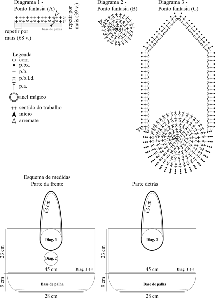 Pontos utilizados no crochê: corr.: correntinha, p.bx.: ponto baixíssimo, p.b.: ponto baixo, p.b.l.d.: p. baixo laç. alça detrás da corr. formada pelo p. da carr. anterior, p.a.: ponto alto, ponto fantasia (A): siga o diag. 1, ponto fantasia (B): siga o diag. 2, ponto fantasia (C): siga o diag. 3.