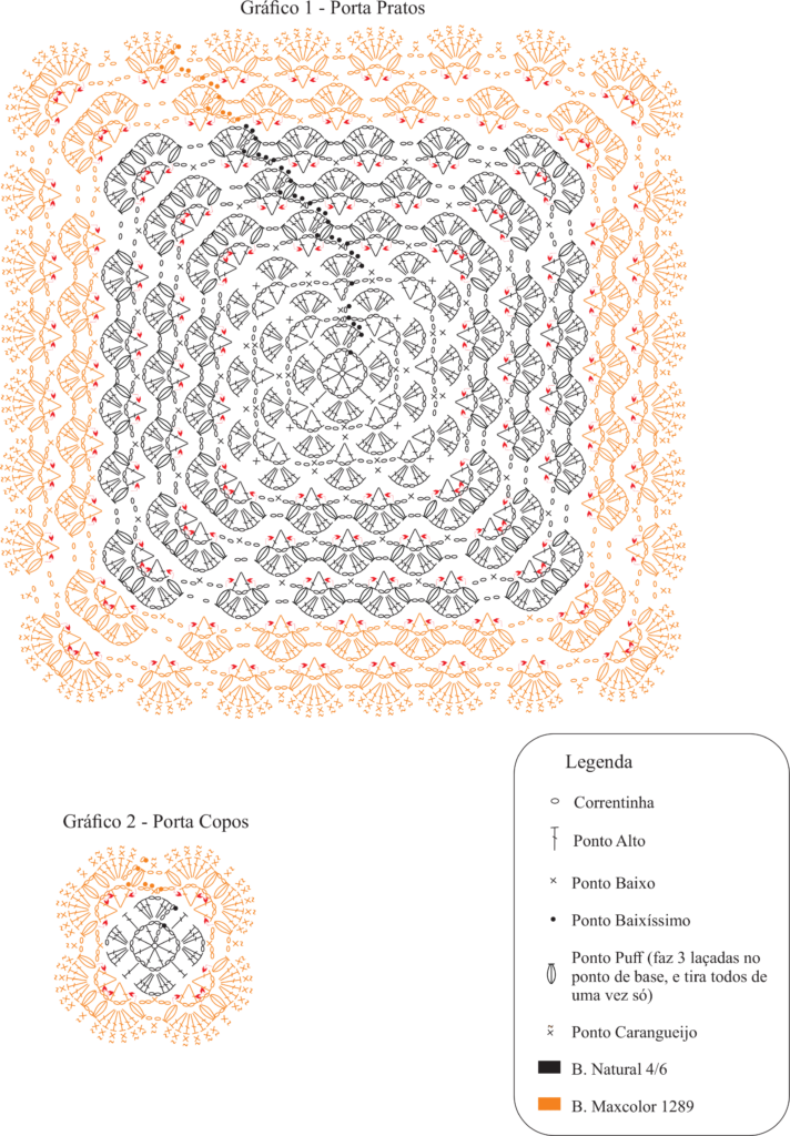 Execução: Gráfico 1 – Porta Pratos (2x) Com o Barroco Natural, inicie com um anel mágico. 1ª carr.: inicie com 5 corr. 1 p.a. * 2 corr. 1 p.a.* repita de *a* mais (6x). Feche com p.b.x. 2ª carr.: 3 corr. 2 p.a. 2 corr. 3 p.a.; *1 p.a.; 3 p.a. 2 corr. 3 p.a. * repita de *a* mais (2x). finalize com 1 p.a. Feche com p.b.x. 3ª carr.: inicie com 1 corr. * 1 p.b.; 3 p.a. 2 corr. 3 p.a.; * repita de *a* mais (7x). Feche com p.b.x. Continue conforme gráfico 1, trabalhando em carr. circulares e realizando as devidas trocas de cores. Feche com p.b.x. Arremate o fio. Faça 2 peças iguais para formar o jogo.