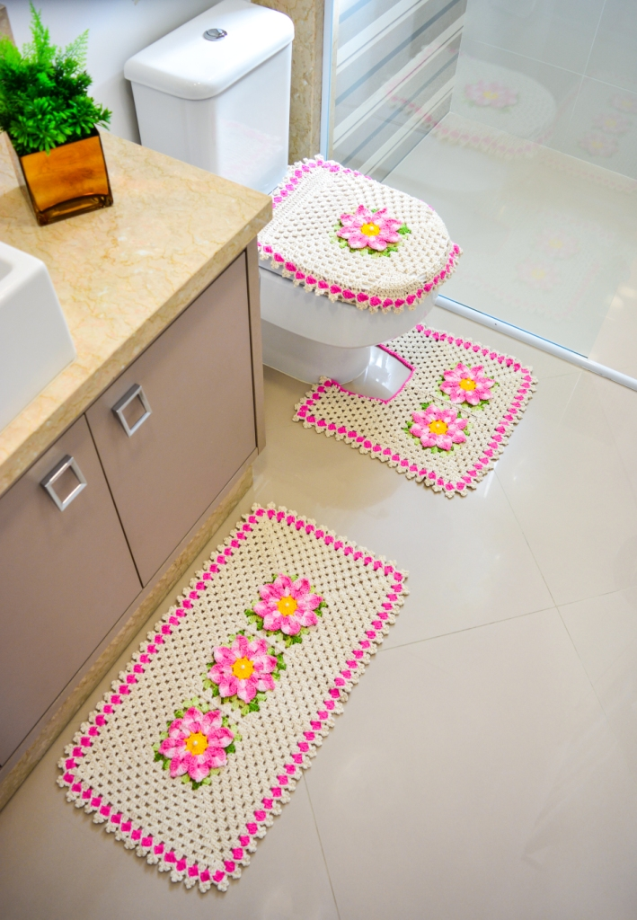Tamanhos: Tapete de Pia: 80 X 42 cm Tapete do Vaso: 53 X 52 cm Tampo: 45 X 40 cm Pontos usados: correntinha (corr); ponto baixo (p.b.); ponto baixíssimo (p.bxmo); ponto alto (p.a.); ponto baixo relevo pegando atrás do ponto de base. Execução –Flor: Com o Maxcolor amarelo faça 6 corr, feche em anel, suba com 3 corr e trabalhe 15 p.a. dentro do anel. 2ª carr: 1 corr, 1 p.b. junto com o p.bxmo, *3 corr, pule 1 p.a., 1 p.b. no p.a. seguinte*. Repita de * a * até completar a volta e termine com p.bxmo na corr inicial. Corte e arremate o fio. 3ª carr:Usando o Multicolor rosa trabalhe em cada alça (3 p.a., 4 corr, 3 p.a.). 4ª carr: *Faça 1 p.b. entre 2 pétalas e na alça trabalhe (6 p.a., 1 picô, 6 p.a.)*. Repita. 5ª carr: *Trabalhe 1 p.b. relevo pegando atrás do próximo p.b., 6 corr*. Repita e no final da carr corte e arremate o fio. Faça 6 flores iguais a esta, trabalhe o quadrado ao redor de cada uma e monte as peças conforme esquemas de montagem e gráficos.