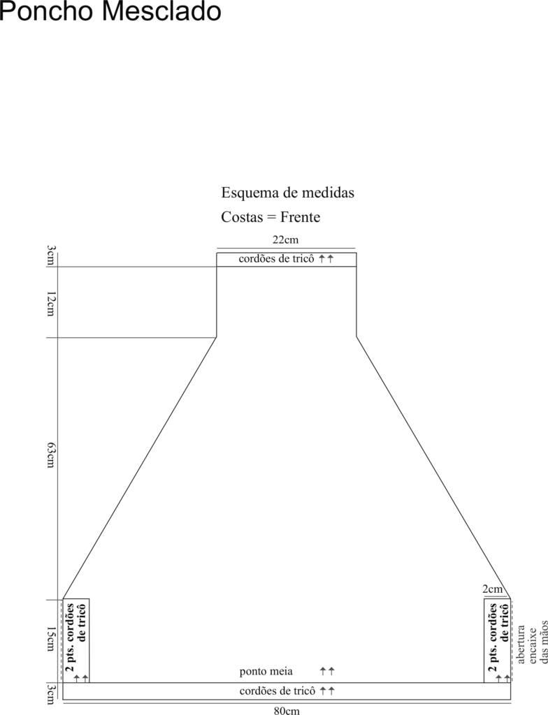 Abreviaturas: p.: ponto, pts.: pontos, m.: meia, t.: tricô, tric.: tricote, diag.: diagrama, v.: vezes, ag.: agulha, dim.: diminuições, rem.: rematar. Ponto utilizado no tricô: Cordões de tricô: todas as carr. em m. ou em t. OBS: (cada cordão de tricô corresponde a 2 carr. de tricô); Ponto meia: direito em m., avesso em t.; Amostra – Um quadrado de 10cm em p. meia ag. nº 8 = 11 p. x 17 carr.. Execução: Transfira os moldes para o papel vegetal para usar como referência na execução da peça. Observe as setas no esquema de medidas com a indicação do sentido do trabalho. Costas – inicie a peça pela barra use o fio Aquarela na cor mescla e monte 84 pts. na ag. de tricô nº 8 e tric. 3 cordões de tricô. Na carr. seguinte tric. da seguinte maneira: 2 pts. (cordões de tricô), 80 pts. (p. meia), 2 pts., tric. desta maneira por 15cm. Prossiga a peça em p. meia, e inicie as dim., a cada 4 carr. rem. de cada lado 1 p. (11 v.) e a cada 2 carr. 1 p. (17 v.). Á 81cm de comprimento desde o início com 28 pts. na ag. tric. a gola em p. meia por 12cm, finalize a peça com 3 cordões de tricô. Arremate o fio e reserve a peça. Frente – Igual a parte das costas. Montagem e acabamento – Use a ag. de tapeçaria e o fio aquarela na cor mescla e feche a gola (15cm), as laterais (63cm), a barra (3cm), deixando a abertura para encaixe das mãos de (15cm). Artesã – Cristina Consortti