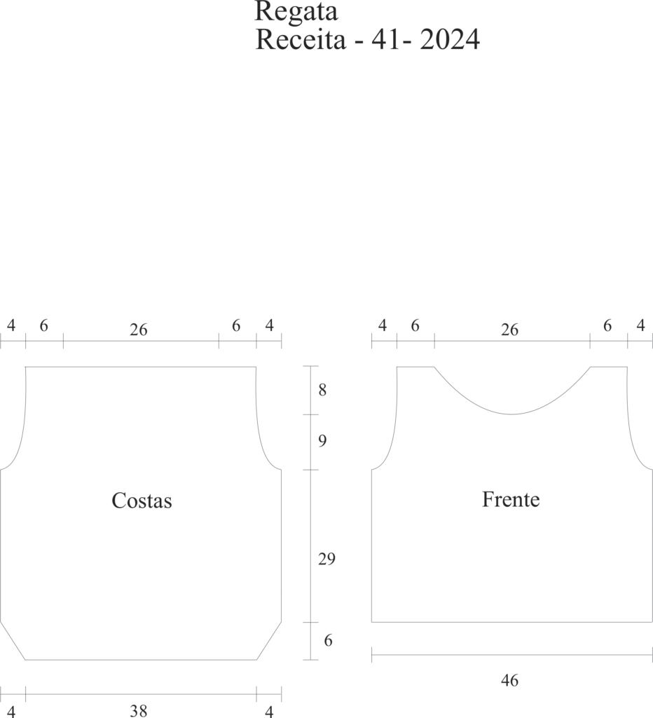 Costas – Monte 50 p. nas ag. nº 7,0mm, tric. 2 carr. em barra 1/1 em seguida tric. em p. meia. em p. meia. Aum. de cada lado cada 2 carr.: 1 p. (5 v.). A 35 cm do início do trabalho para as cavas rem. de cada lado 2 p. (2 v.) e 1 p. A 52 cm do início do trabalho rem. Frente – Monte 60 p. nas ag. nº 7,0mm, tric. 2 carr. em barra 1/1 em seguida tric. em p. meia. A 35 cm do início do trabalho para as cavas rem. de cada lado cada 2 carr.: 2 p. (2 v.) e 1 p. A 44 cm do início do trabalho para o decote rem. os 14 p. centrais e termine cada lado separadamente. Rem. do lado do decote cada 2 carr.: 4 p., 3 p. e 2 p. e 1 p. A 52 cm do início do trabalho rem.