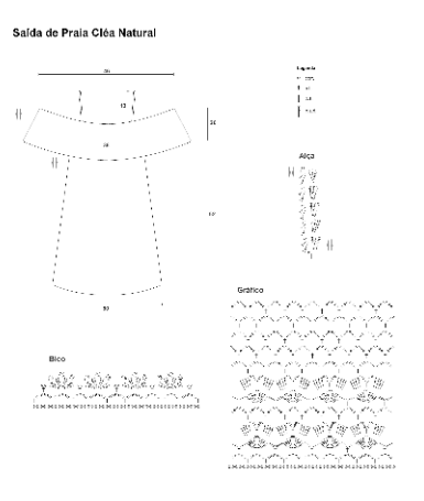 Pontos utilizados: corr. – correntinha, p.bx. – ponto baixíssimo, p.b. – ponto baixo, p.a. – ponto alto, p.a.d. – ponto alto duplo. Abreviaturas – p.: ponto, nov. – novelo, carr. – carreira, ag. – agulha, trab.: trabalhe, diag. – diagrama, rep. – repetição. Execução Usando a ag. de crochê Círculo de 1mm e o fio Cléa, inicie os ombros fazendo 160 corr. e feche a argola com 1 p.bx.. Observe o Gráfico. 1ª carr.: 5 corr. e 1 p.b. a cada 5 pontos de base, por toda a volta. Feche com 1 p.bx.. 2ª carr.: 4 p.a.d., 2 corr. e mais 4 p.a.d. sobre uma alça de base; 3 corr., 1 p.b. e 3 corr. sobre a alça de base seguinte. 3ª carr.: 4 p.a.d., 4 corr., 1 p.b., 4 corr. e 4 p.a.d.. Continue seguindo o Gráfico em carr. circulares, até atingir o comprimento de 20cm. Nesta etapa deixamos para trás as mangas e passamos a tecer ao redor do tórax, seguindo para a cintura. Faça a medição para que ambos os braços tenham o mesmo espaço para passar. Agora temos uma circunferência menor para as próximas carr.. Continue seguindo o Gráfico, fazendo aumentos quando necessário, até completar o comprimento de 52cm abaixo dos ombros. Acabamento – Faça um bico de p.a.d. e ponto picô (3 corr. e 1 p.b.) conforme o diagrama Bico ao final do comprimento. Faça também um bico a cada repetição do Gráfico, formando babados ao longo da saída. Finalize tecendo as alças de acordo com o diagrama Alça no detalhe. Tamanho 36/38