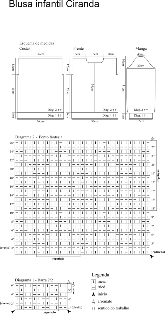 Abreviaturas: p.: ponto, pts.: pontos, m.: meia, t.: tricô, tric.: tricote, ag.: agulha, aum.: aumente, rem. – rematar ou rematando, v. – vez, rep.: repetição. Ponto utilizado no tricô: Ponto barra 2/2: siga o diag. 1; Ponto fantasia: siga o diag. 2. Amostra: Um quadrado de 10cm no p. meia na ag. nº 4,5 = 18 p. x 22 carr.. (Ponto meia: direito em m., avesso em t). Execução: Transfira os moldes para o papel vegetal para usar como referência na execução da peça. Observe as setas no esquema de medidas com a indicação do sentido do trabalho. Costas – use o fio Ciranda na cor mescla e monte 64 pts. na ag. nº 4,5 e tric. a peça no p. de barra 2/2 acompanhando o diag. 1 e os pts.. de rep. por 4cm.. Ao fazer a última carr. do p. de barra 2/2 aum. alternadamente na carr. 13 pts., totalizando 71 pts. na ag.. Prossiga a peça no p. fantasia acompanhando o diag. 2 e os pts. de rep.. À 41cm de comprimento desde o inicio forme as cavas, rem. de cada lado da peça 5 pts. (1 v.). À 41cm de comprimento desde o início rem . todos os pts. da ag. e reserve a peça. Frente – use o fio Ciranda na cor mescla e monte 64 pts. na ag. nº 4,5 e tric. a peça no p. de barra 2/2 acompanhando o diag. 1 e os pts.. de rep. por 4cm.. Ao fazer a última carr. do p. de barra 2/2 aum. alternadamente na carr. 13 pts., totalizando 71 pts. na ag.. Prossiga a peça no p. fantasia acompanhando o diag. 2 e os pts. de rep.. À 41cm de comprimento desde o inicio forme as cavas, rem. de cada lado da peça 5 pts. (1 v.). À 34cm de comprimento desde o início forme o decote, rem. os 19 pts. centrais e prossiga cada lado separadamente. Rem. do lado do decote a cada 2 carr. 1 p. (3 v.). À 42cm de comprimento desde o inicio rem. todos os 18 pts. restantes para formar cada ombro. Reserve a peça. Manga – use o fio Ciranda na cor mescla e monte 32 pts. na ag. nº 4,5 e tric. a peça no p. de barra 2/2 acompanhando o diag. 1 e os pts.. de rep. por 4cm.. Ao fazer a última carr. do p. de barra 2/2 aum. alternadamente na carr. 19 pts., totalizando 51 pts. na ag.. Prossiga a peça no p. fantasia acompanhando o diag. 2 e os pts. de rep.. À 35cm de comprimento desde o inicio forme a parte arredondada da manga rem. de cada lado 5 pts. (1 v.), e a cada 2 carr. 2 pts. (5 v.). À 45cm de comprimento desde o inicio rem. os 21 pts. restantes da ag.. Faça a outra manga igual e reserve-as. Montagem e acabamento – Use a ag. de tapeçaria e o fio Ciranda na cor mescla e feche as laterais (29cm), deixando a abertura das cavas (12cm). Feche o ombro esquerdo (8cm), deixe o ombro direito aberto para facilitar a execução da gola. Levante na ag. de tricô nº 4,5 ao redor do decote 74 pts. e trab. em p. de barra 2/2 acompanhando o diag. 1 e os pts. de rep. por (10cm), rem. todos os pts. da ag. e deixe a abertura da gola do lado direito da peça de modo que a gola fique sobreposta ao redor do decote. Retorne para a ag. de tapeçaria e feche o ombro direito (8cm). Feche as mangas e costure-as ao redor das cavas. Artesã: Gorete Andrade/Código – 1808
