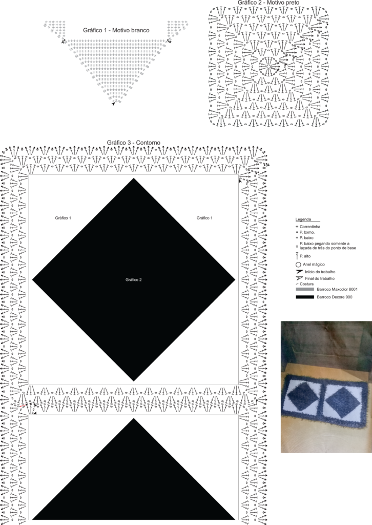 Contorno: 4 carr. com o fio Decore na cor preta. Fazer primeiro 2 carr. ao redor da 1ª parte, sendo que um dos lados só terá 1 carr. Depois, fazer 2 carr. completas ao redor da outra parte. Deixar o fio à espera e, com o fio na cor preta, costurar essas partes. Retomar o trabalho e terminar fazendo as 2 últimas carr. ao redor do tapete. Seguir o gráfico 3.