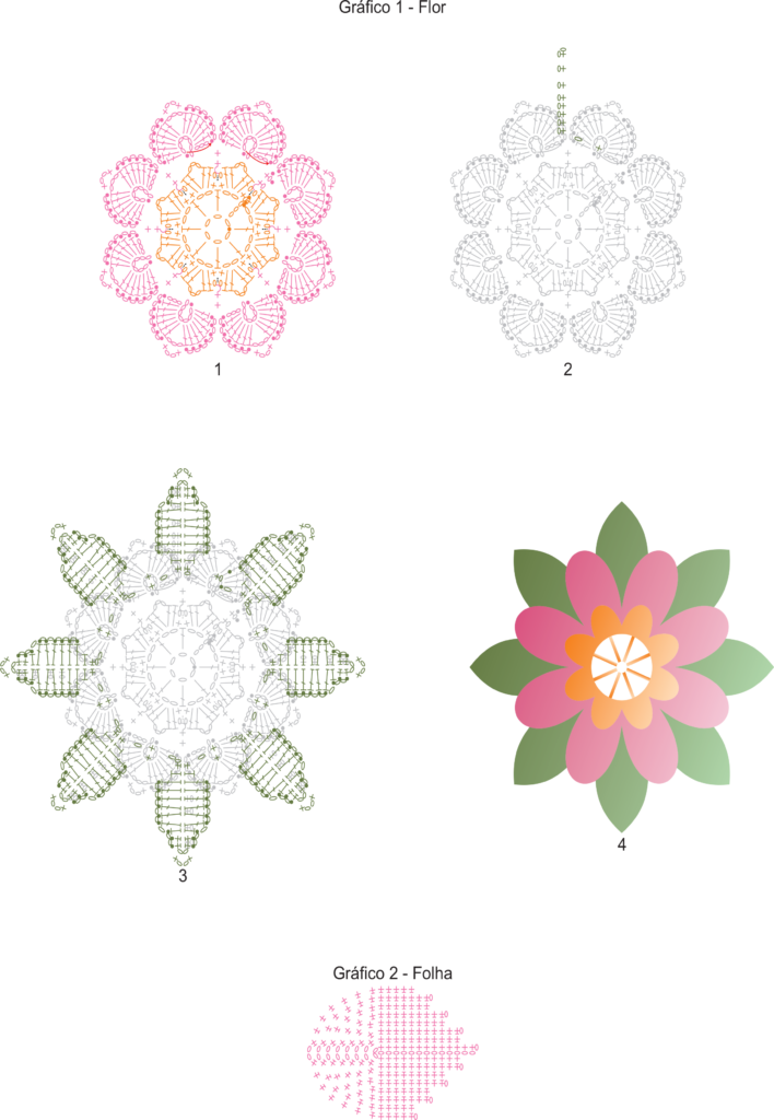 Folha (com o fio na cor flor – 30x): com o fio na cor flor, faça 13 correntinhas mais 1 corr. para virar e siga o gráfico 2.
