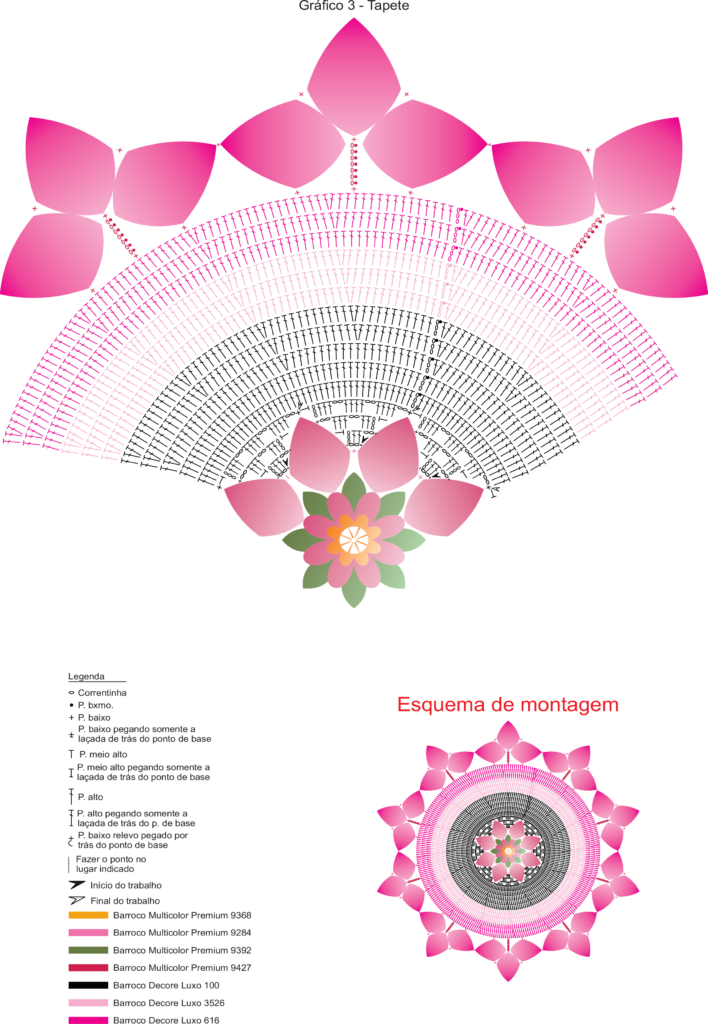 Continue seguindo o gráfico, fazendo um total de 8 carr.. Una as folhas com p. baixo entre si e na flor na última carr. do gráfico, como mostra o esquema de montagem.