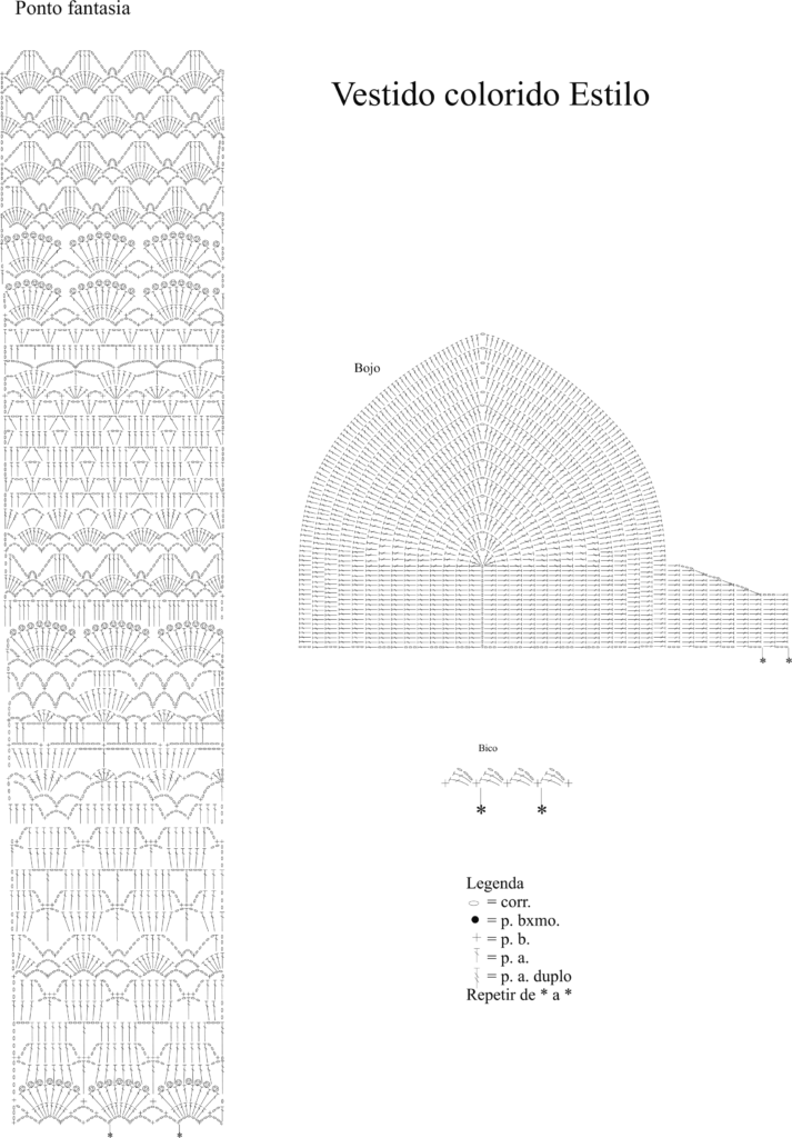 Tamanho: 38/40 Pontos utilizados Correntinha (corr.). Ponto baixíssimo (p. bxmo.): Introduza a ag., laç., puxe o p. e passe diretamente no p. da ag.. Ponto baixo (p. b.): introduza a ag. laç., puxe o p. e com outra laç., rem. todos os p.. Ponto alto (p. a.): laç., introduza a ag., laç., puxe o p. laç., rem., 2 p. e com outra laç., rem. todos os p.. Ponto alto duplo (p. a. duplo): 2 laç., introduza a ag., * laç., puxe o p. laç., rem., 2 p.* (2 v.) e com outra laç., rem. todos os p.. Ponto fantasia: siga o gráfico. Bojo: siga o gráfico. Bico: siga o gráfico. Amostra – Um quadrado de 10 cm em p. a. com a ag. nº 1,75 = 26 p. x 14 carr. Execução – Frente e costas – São trabalhadas juntas. Comece pelos bojos. Bojo – Com o fio branco faça uma corr. de 18 p. mais 3 corr. para virar e trabalhe o bojo seguindo o gráfico. Terminado o gráfico repita de * a * (20 v.). Faça dois bojos iguais. Costure os bojos entre si, para fechar em círculo, costure 5 cm na parte da frente (veja foto). Com os bojos prontos e costurados, trabalhe a toda volta em p. fantasia seguindo o gráfico, repita de * a * (15 v.). Trabalhe na seguinte ordem de cores: 3 carr. branco, 5 carr. marsala, 2 carr. militar, 5 carr. marsala, 2 carr. castanha, 5 carr. mostarda, 2 carr. castanha, 3 carr. branco, 1 carr. militar, 5 carr. tabaco, 2 carr. amêndoa, 1 carr. marsala, 4 carr. amêndoa, 1 carr. militar, 4 carr. mostarda, 1 carr. militar, 6 carr. branco, 12 carr. tabaco. Terminado o gráfico rem.. Faça com o fio mostarda ao longo do decote frente e costas o bico seguindo o gráfico. Prenda o fio mostarda na ponta do bojo e faça uma corr. de 80 p. e prenda na 10ª carr. contadas da costura das costas. Volte no lado da cava com uma carr. em p. b. na corr. e *1 p. b., 3 corr.* no bico. Trabalhe no lado do decote em p. a. na corr. e *1 p. b. e 3 corr.* no bico. Forre o vestido.