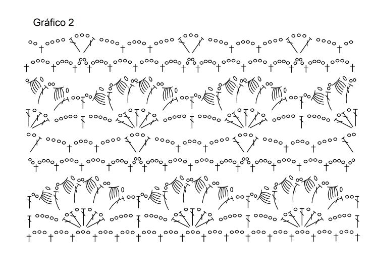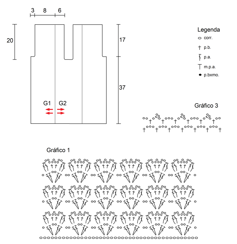 - Metade esquerda: Idêntica à direita, une-se a primeira parte utilizando alças de correntinhas e pontos baixos, seguindo o Gráfico 3 para acabamento do decote e comprimento.