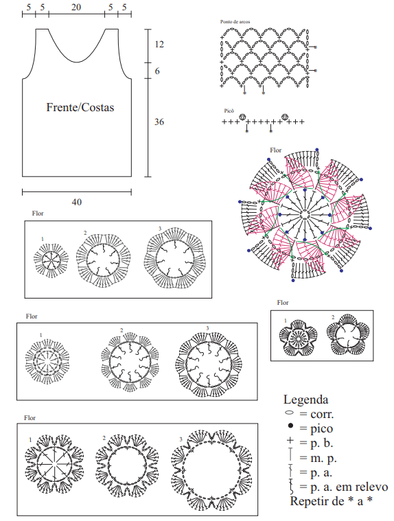 Frente e costas – São trabalhadas juntas. Com o blush, faça uma corr. de 212 p. feche em círculo e trabalhe em p. de arcos seguindo o gráfico, repita de * a * no sentido dos p. (52 v.). A 36 cm do início, para as cavas, divida o trabalho em duas partes iguais. Nesta altura trabalhe frente e costas separadamente.
