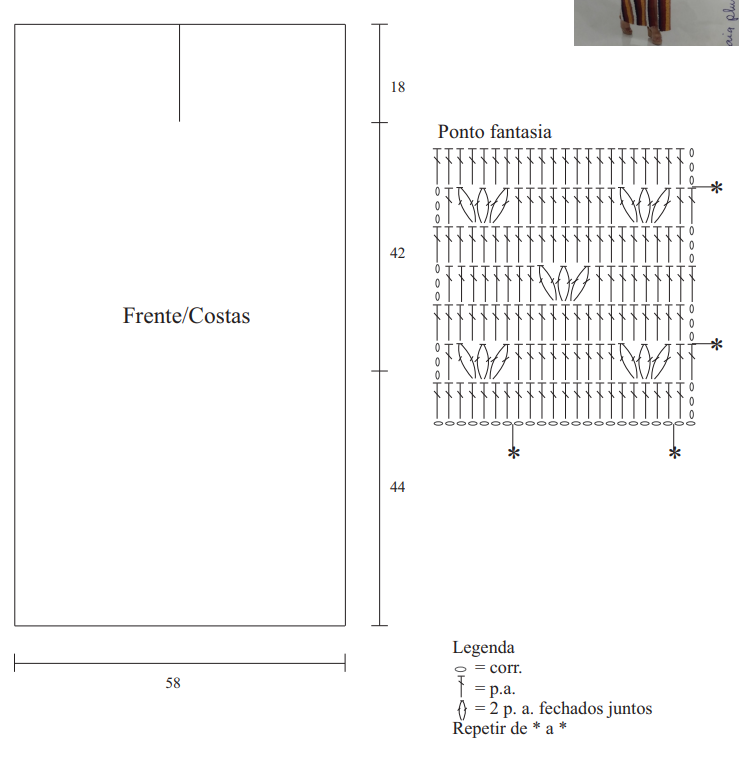 Para a frente e costas: Trabalhe as duas partes juntas. Inicie com o fio marsala, criando uma corrente de 162 pontos mais 3 pontos para virar e trabalhe em ponto fantasia conforme o gráfico, repetindo o padrão entre * a * 11 vezes, mais as bordas. A primeira etapa inclui 2 carreiras com o fio marsala. No outro lado da corrente base, continue seguindo a sequência de cores: 2 carreiras uva, 2 carreiras anil profundo, 3 carreiras off White, 2 carreiras lenha, 3 carreiras mostarda, 2 carreiras marsala, repetindo a sequência 7 vezes. Ao completar a sexta listra off White, deixe 18 cm aberto de um dos lados para o zíper.