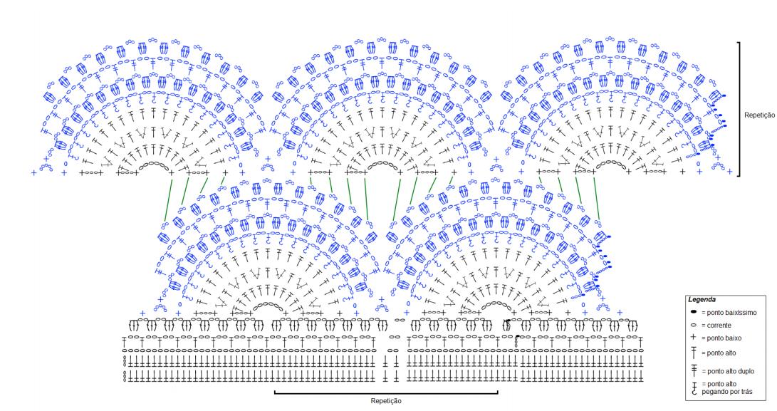 3ª carr: 1 pb nas últimas 2 corr, 6 corr, pule 2 grupos de 3 pa fechados juntos, 1 pb nas próximas corr de base, 3 corr, 1 pb nas próximas corr, volte, 11 pa nas corr, 1 pb nas próximas corr de base, 3 corr, 1 pb nas próximas corr, volte, 2 pa no 1º pa, 1 pa no próximo pa, *2 pa no próximo pa, 1 pa no próximo pa*, repetir de * a * mais 3 vezes, 2 pa no próximo pa, 1 pb nas próximas corr de base, 3 corr, 1 pb nas próximas corr de base, volte, 1 pa em cada pa anterior, 1 pb nas próximas corr de base. Arremate.