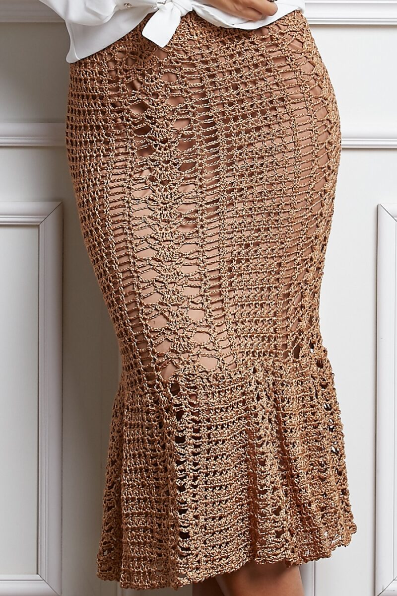 - Saia midi neutra + blusa de crochê = visual elegante e artesanal.