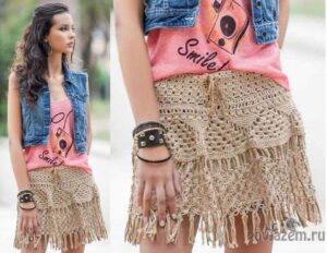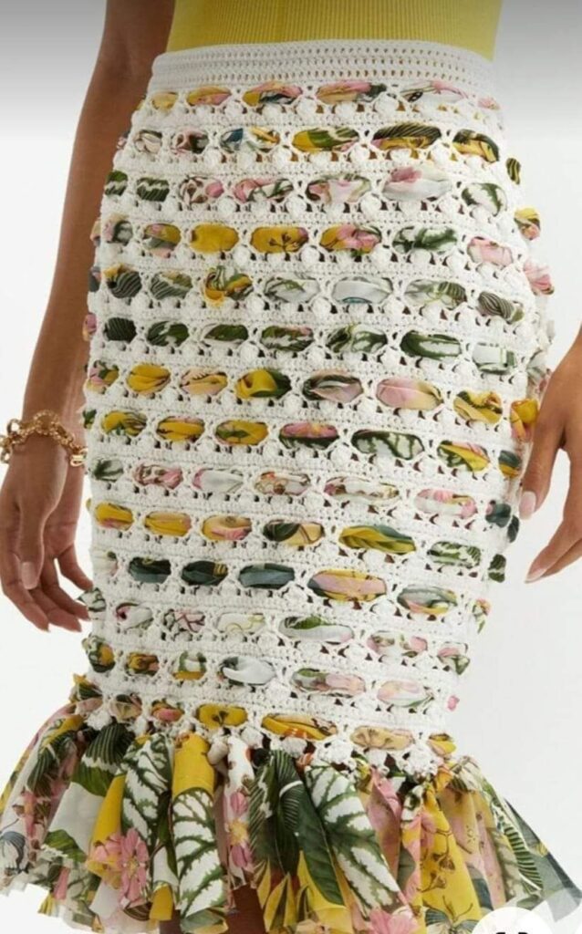 Para quem quer apostar em algo mais ousado e descontraído, a saia curta de crochê é uma ótima pedida. Pode ser usada como saída de praia ou combinada com peças mais formais, criando um contraste interessante entre o artesanal e o moderno. - Saia de Crochê com Babados