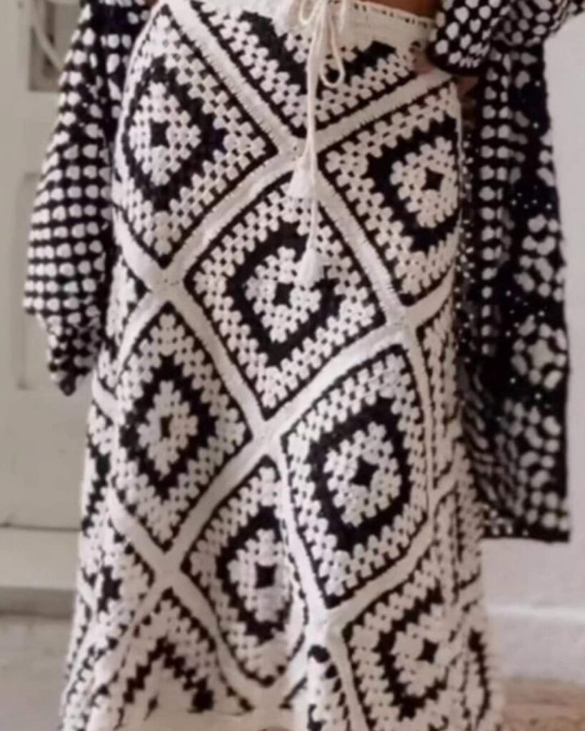Elegante e sofisticada, a saia midi de crochê é perfeita para looks casuais e também para eventos mais formais. O comprimento médio, aliado aos pontos trabalhados, cria uma peça única que combina muito bem com sandálias, tênis ou até mesmo botas. - Saia Longa de Crochê