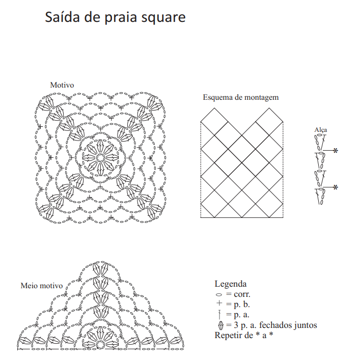 Criar os motivos em crochê consiste em confeccionar os conhecidos quadradinhos da vovó. Inicia-se com uma correntinha de seis pontos, fechando em um círculo que servirá de base para o motivo. A partir daí, segue-se um gráfico específico para completar o motivo. Em geral, são necessários 40 motivos para uma saída de praia tamanho 38/40, cada um com aproximadamente 9 cm de lado, que são unidos na última carreira.