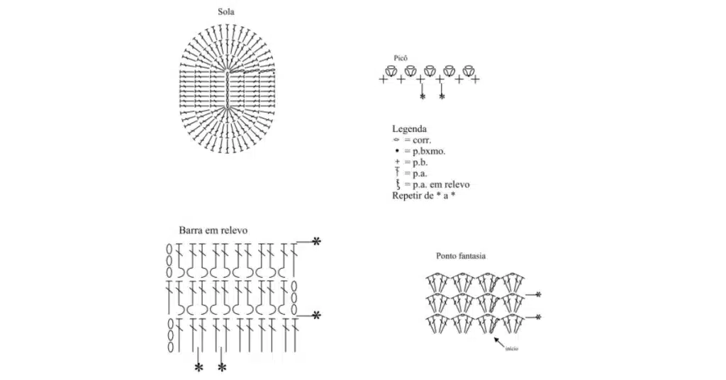 Então, ponto alto em relevo direito (p.a. em relevo): laç., introduza a ag. horizontalmente por trás do p.a. da carr. anterior, laç., puxe o p. laç., rem., 2 p. e com outra laç., rem. todos os p.. P. alto em relevo avesso (p.a. em relevo): laç., introduza a ag. horizontalmente pela frente do p.a. da carr. anterior, laç., puxe o p. laç., rem., 2 p. e com outra laç., rem. todos os p..Sola: siga o gráfico. Ponto fantasia: siga o gráfico. Picô: siga o gráfico. Barra em relevo: siga o gráfico.
