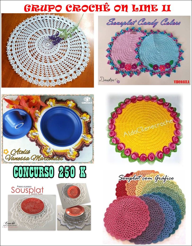 1 – Escolha e confeccione um destes 6 modelos de sousplats ( poderá ser feito com QUALQUER FIO e COR E quantidade ) não postar vídeo ou gráfico da peça no grupo / se fizer pelo gráfico poderá ser salvo através do seu celular )