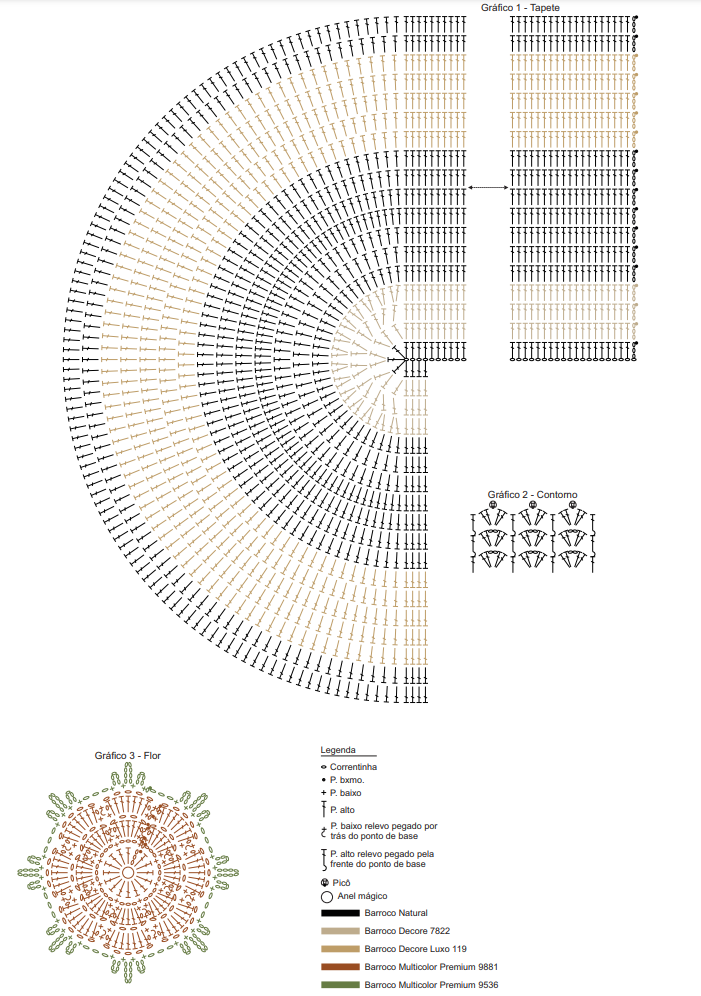 2. Siga o gráfico 1 para a construção do padrão do tapete, atentando-se à troca de cor dos fios conforme indicado no gráfico. Este detalhe garante um visual harmonioso e bem trabalhado.