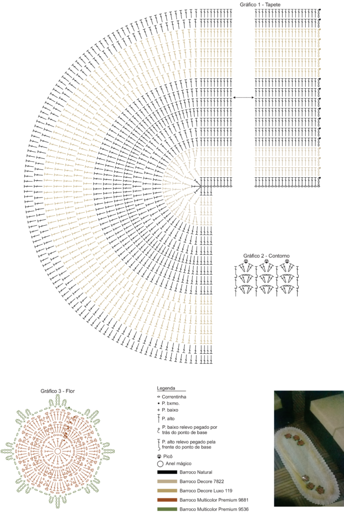 Tapete: com o fio na cor natural, fazer 107 correntinhas mais 3 corr. para virar e seguir o gráfico 1. Observar a troca de cor dos fios no gráfico.