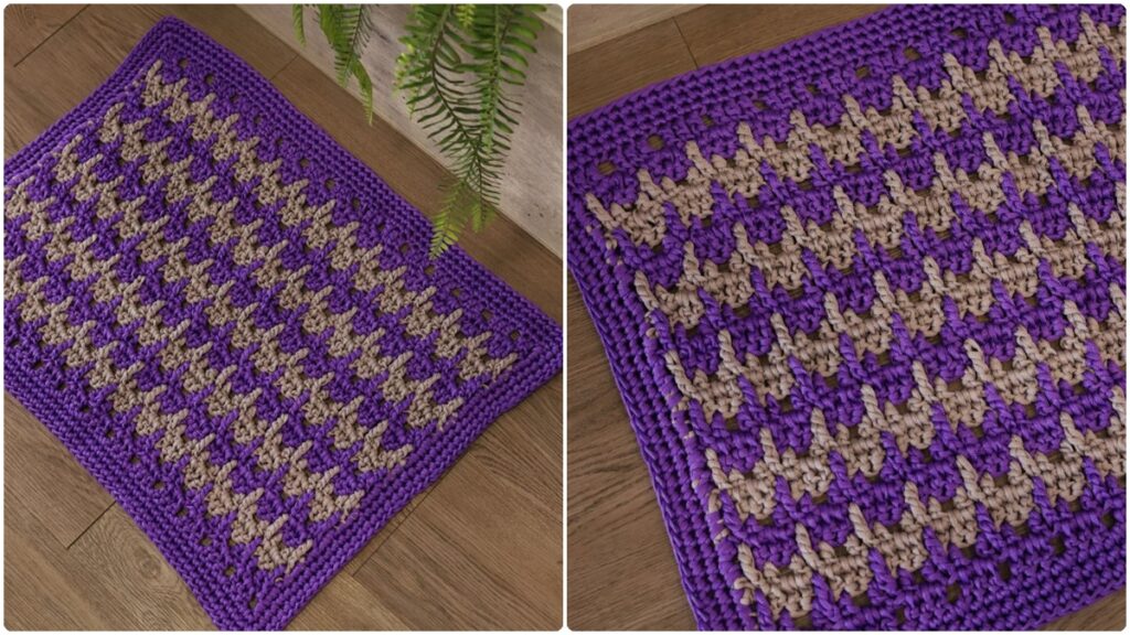 Para finalizar, é importante dedicar atenção ao acabamento. A etapa final consiste em contornar todo o tapete utilizando pontos baixos, principalmente nos cantos, para garantir firmeza e uniformidade. Essa borda é feita com o fio púrpura, reforçando a estrutura da peça e deixando-a ainda mais elegante.