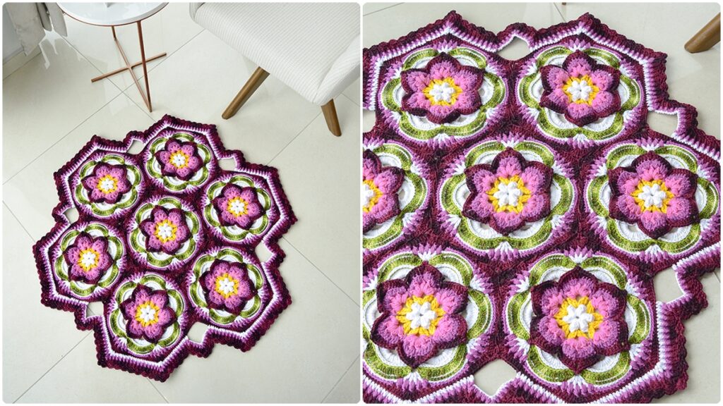 O processo tem início com a confecção de motivos individuais. Cada um deles segue uma sequência de carreiras circulares, sempre utilizando os pontos e combinações indicadas no gráfico escolhido. Nas etapas iniciais, emprega-se o método do anel mágico para centralizar o motivo. A partir daí, alterna-se entre correntinhas, pontos altos e o característico ponto pipoca, que confere textura e volume ao centro floral. Com as trocas de cores, cria-se o efeito natural das pétalas e folhas, enriquecendo o visual do tapete.
