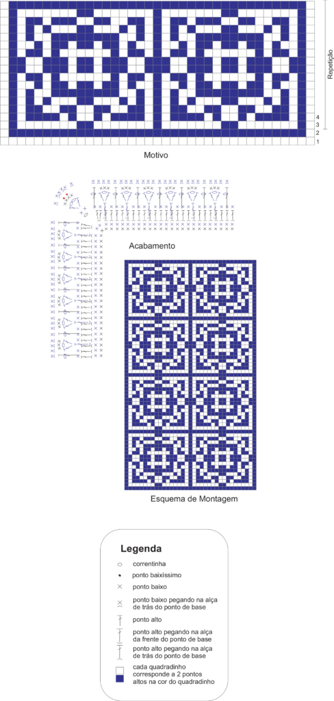 Continue acompanhando o gráfico do motivo. Considere cada quadradinho 2 p.a. da respectiva cor. Trabalhe 4 vezes o motivo e passe as voltas de acabamento.
